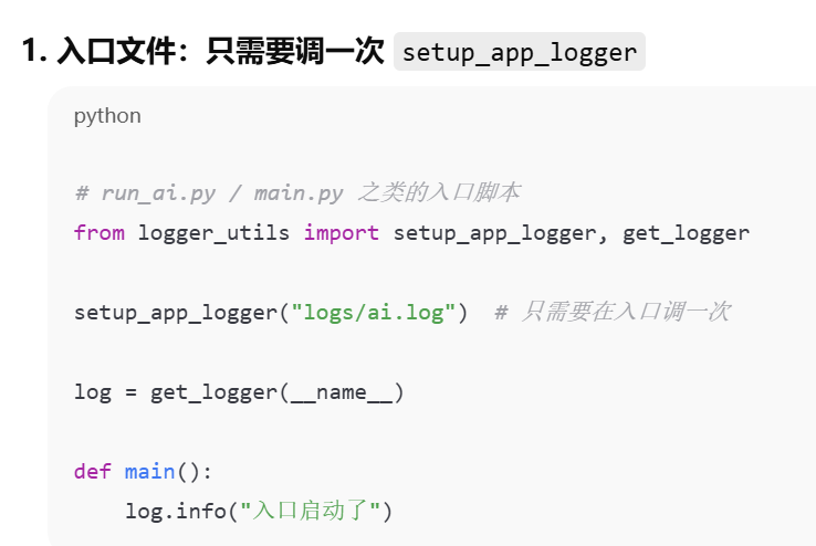 然后入口脚本设置自己的日志文件。这样从入口调到的所有python文件都写到了该日志文件中,因为非如入口文件是get_logger(__name__),返回logging.getLogger(f"{APP_LOGGER_NAME}.{name}"),然后也没配置自己的handle,所有冒泡到父亲APP_LOGGER_NAME
