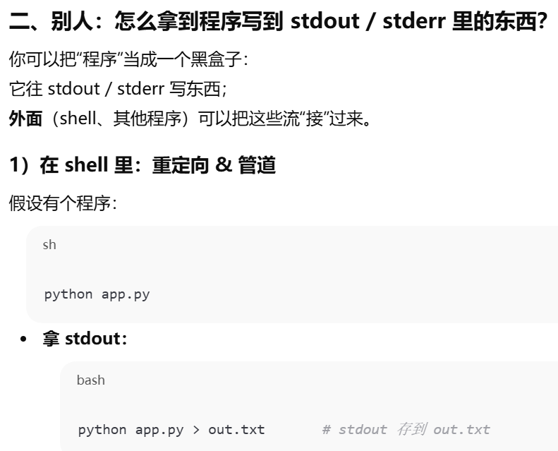 别的东西怎么拿到这个程序写到 stdout / stderr 里的内容?(重定向、管道、捕获)