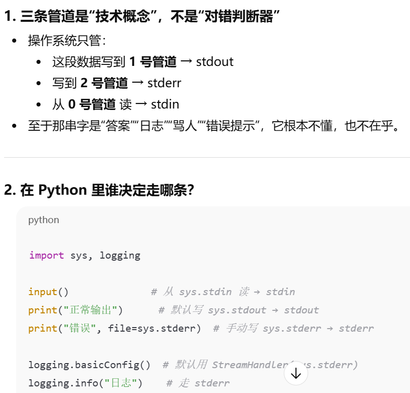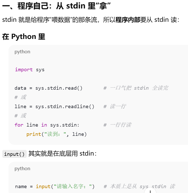 不管是 shell 还是 Python,stdin / stdout / stderr 都是 3 条"管道"(标准流)。