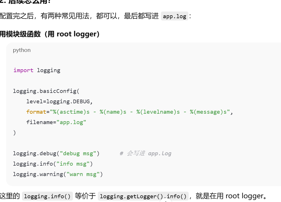 basicConfig 是在给 整个 logging 系统的"老大"------root 日志记录器 做初始化配置的,同时顺带创建一个默认的 Handler。