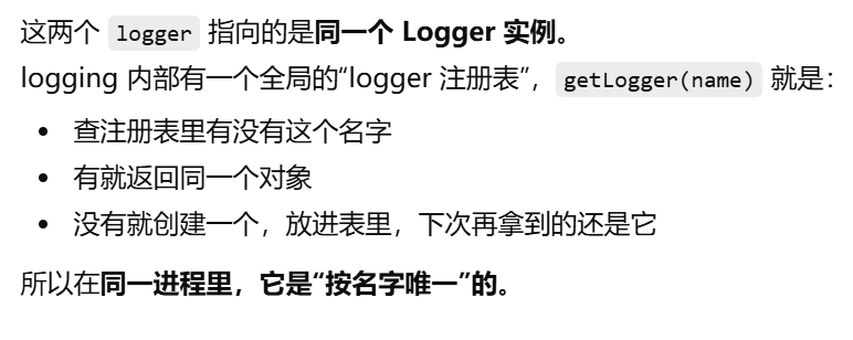 在同一个 Python 进程里,logging.getLogger("名称") 是"按名字全局唯一的单例"。进程间不共享