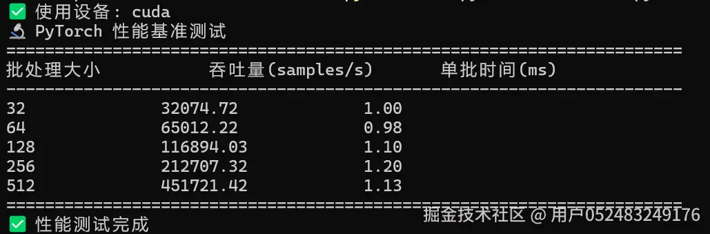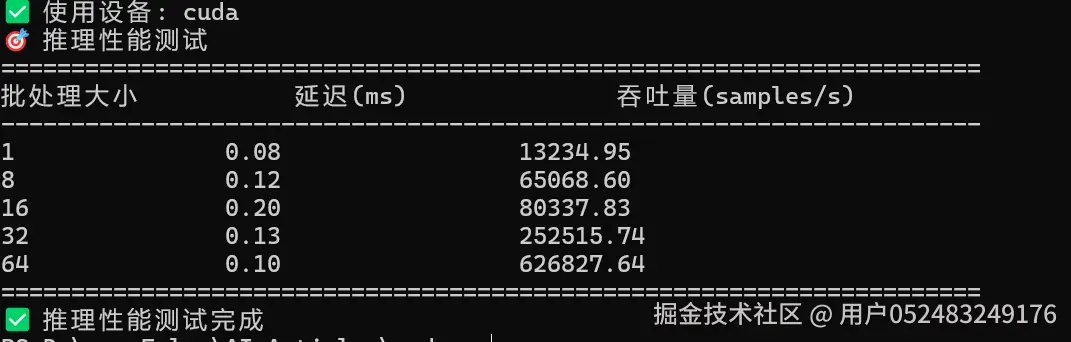 print(f"{'批处理大小':<15} {'吞吐量(samples/s)':<20} {'单批时间(ms)':<20}")