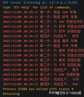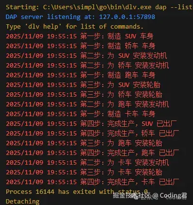 log.Printf("第四步:完成生产,%s 已出厂\n", car)