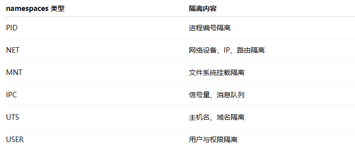 namespace 负责隔离,cgroup 负责资源控制。容器 = namespace + cgroup + rootfs。