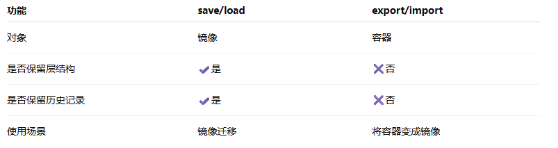 注意:export 导出是"文件系统快照",不包含镜像层结构和历史记录。