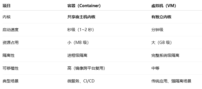 容器是运行在宿主机上的一个独立隔离进程,拥有自己的运行环境,但共享宿主机内核。