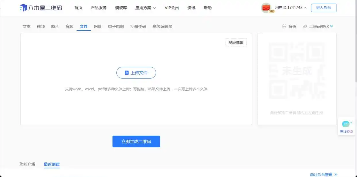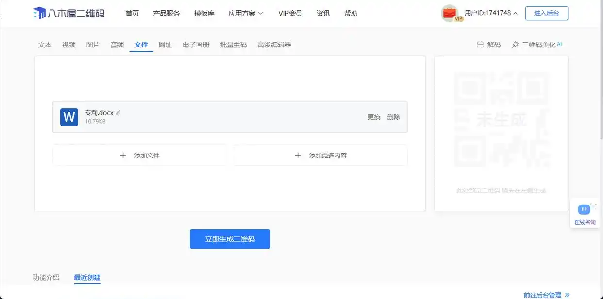 上传好文件后,接下来就是生成二维码了。在八木屋二维码生成器上,上传完文件,系统很快就能生成对应的二维码。你可以在页面上看到生成的二维码图案。