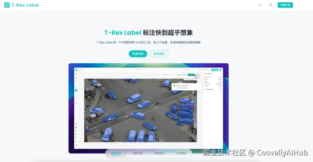 作为2025年异军突起的标注工具,T-Rex Label 以高效易用的 AI 辅助标注为特色,搭载 SOTA 视觉模型 T-Rex2 和 DINO-X,支持视觉提示功能,在罕见物体识别和密集目标检测中表现优异。工具开箱即用,无需安装,支持 bbox 和 mask 标注,兼容 COCO、YOLO 等主流格式。