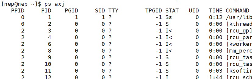 ps axj:显示进程的 PID、PPID、进程组 ID(PGID)等,方便查看进程间的父子关系(PPID为父进程ID)