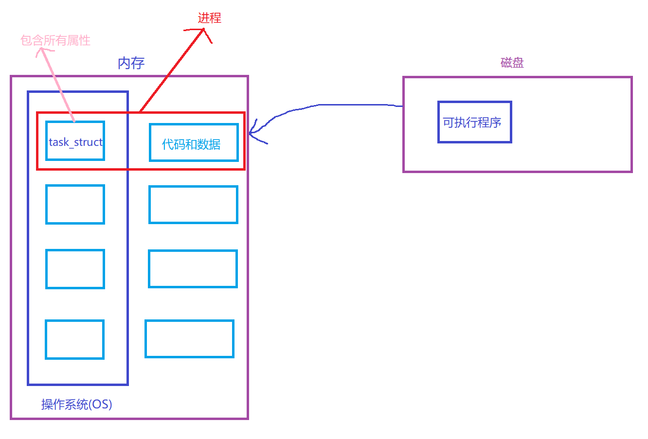 来源: 磁盘上的 "可执行程序" 被加载到内存后,会拆分为两部分 ------代码和数据(程序要执行的指令、要处理的内容) + 操作系统自动创建的task_struct(也就是 PCB,存储进程的 PID、状态、优先级等所有属性)。