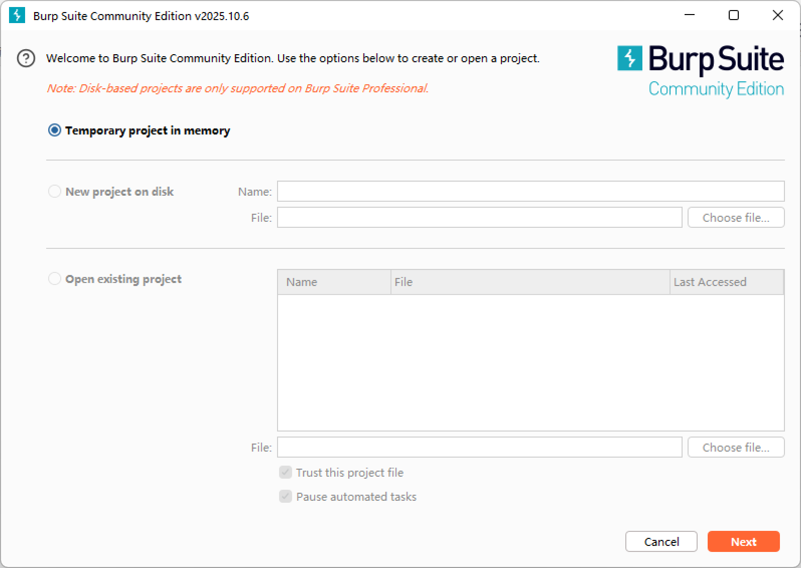 社区版(Community Edition)只能用 "内存临时项目",不支持 "磁盘项目"