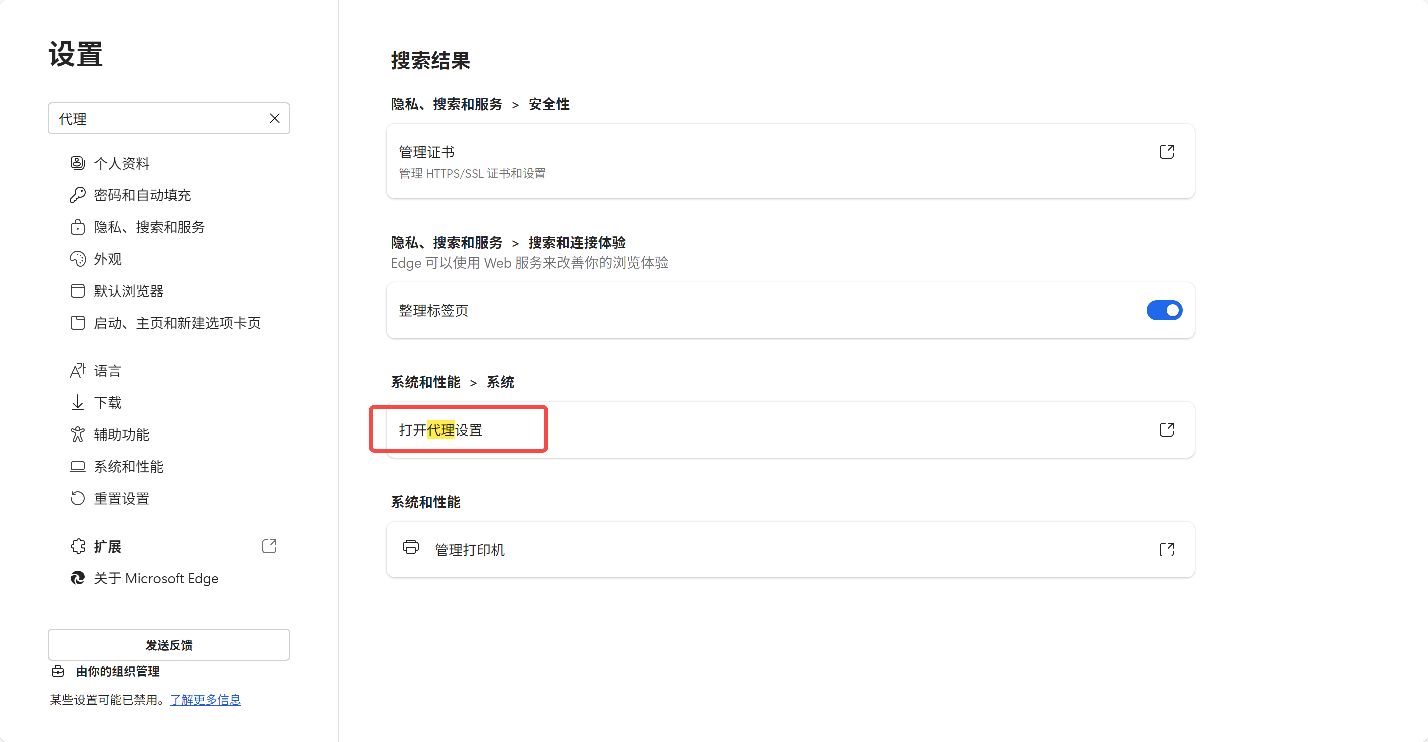 打开 Edge 浏览器,打开设置,搜索"代理"
