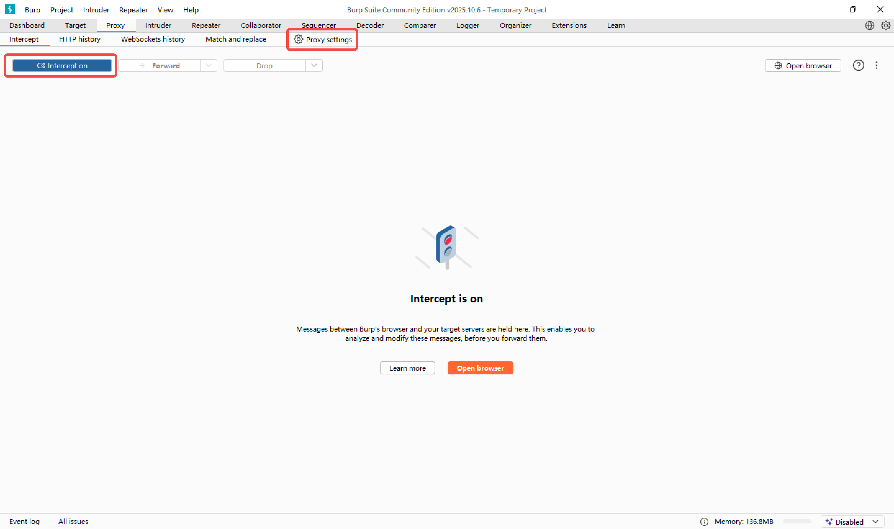 切换到 Intercept 子标签页,确保右上角的 Intercept is on(拦截已开启)(如果显示 "Off",点击切换为 "On")。