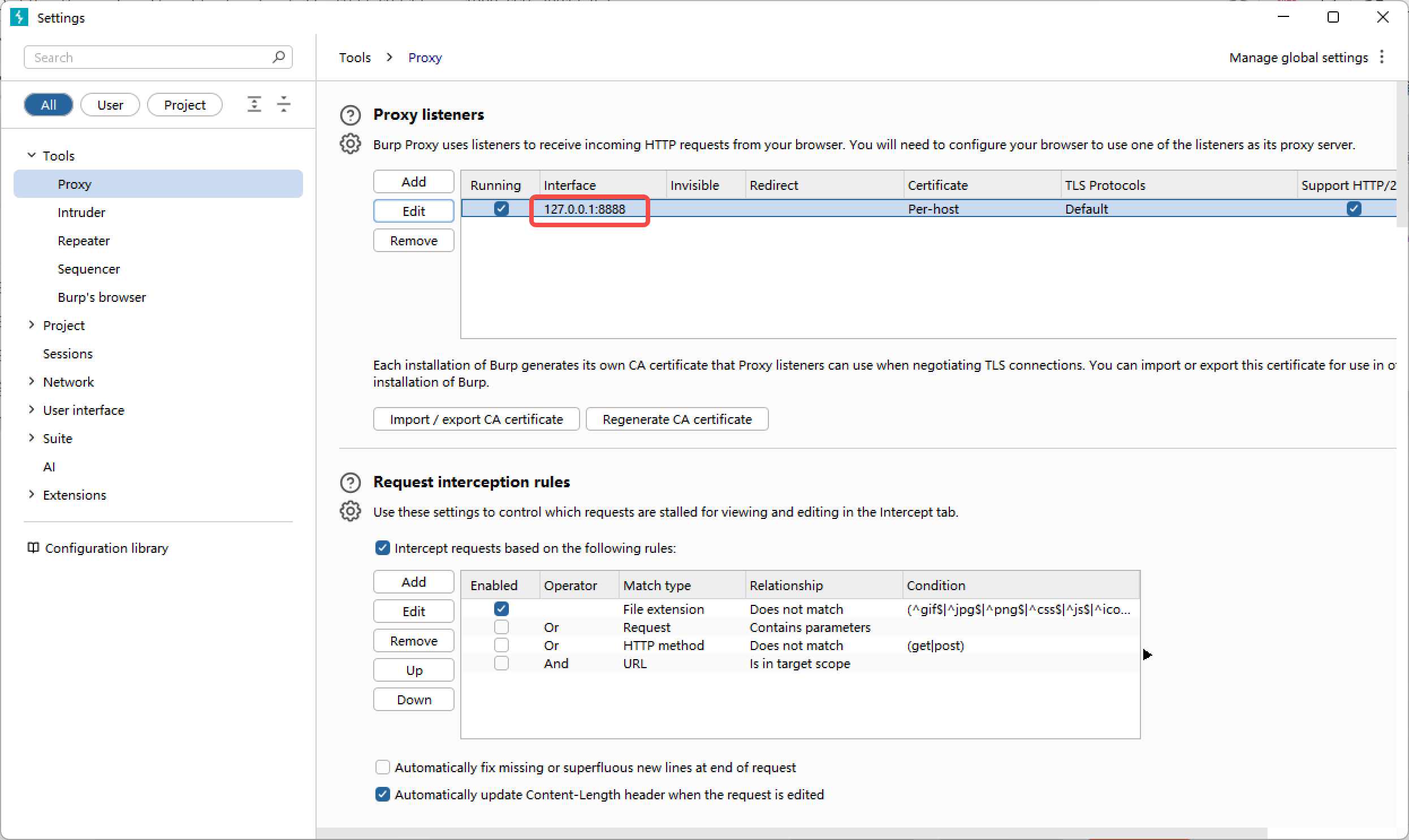 再点击 Proxy settings 子标签页,确认 "Proxy Listeners" 下默认的监听配置是: