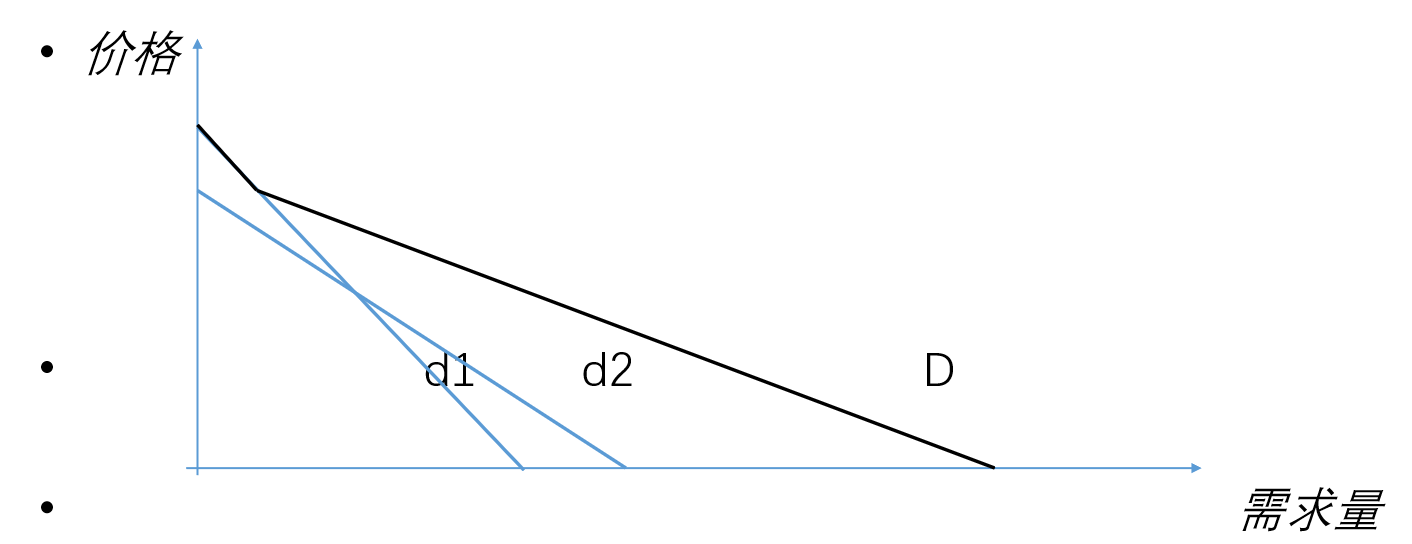 - 市场需求曲线 (D):由 d1 和 d2 加总而成的,代表了整个市场的需求。