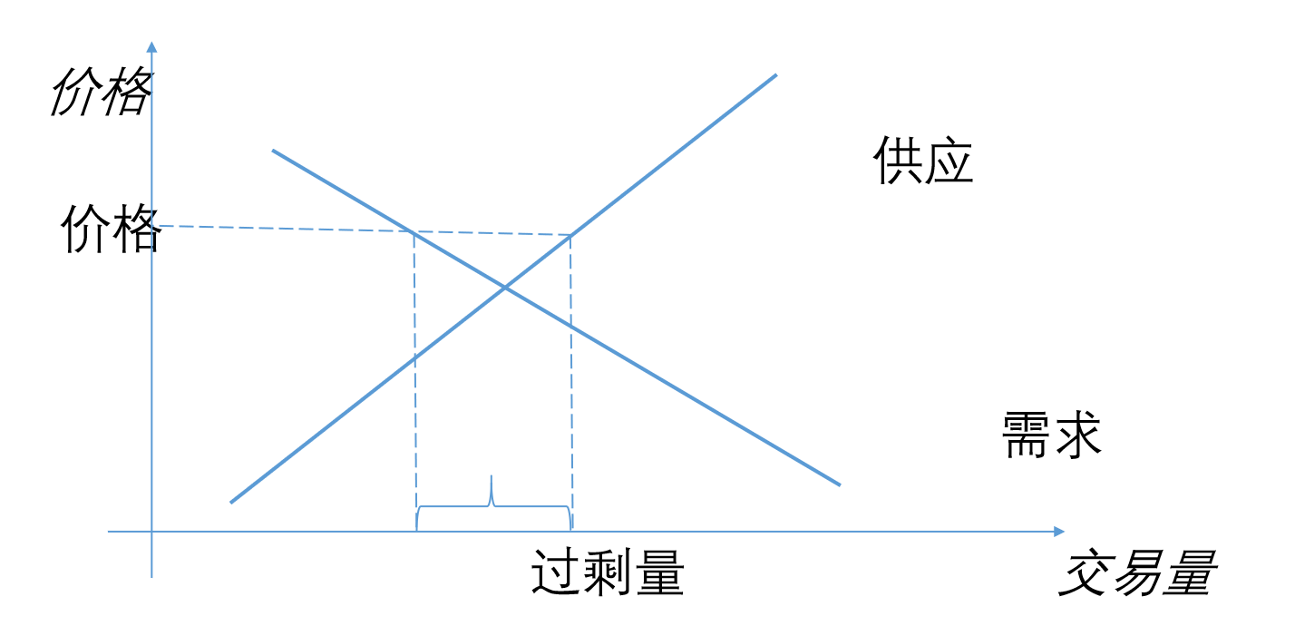 - 产生缺口:市场上供给量大于了需求量。卖不出去的商品数量就是产品过剩,也叫作剩余。图中的"过剩量"标签就标示了这个差额。