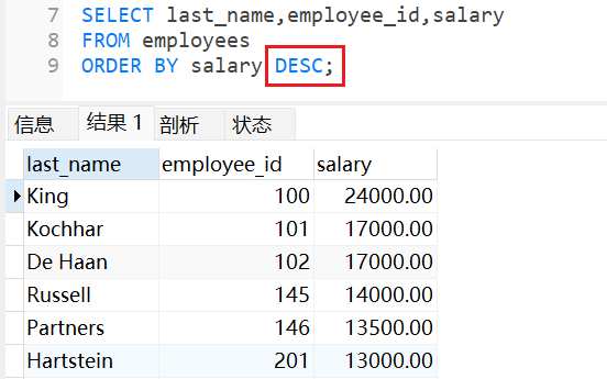 - 搭配 ASC(ascend)升序,DESC(descend)降序使用