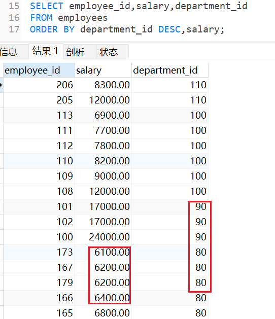(1)显示员工信息,按照部门编号降序并且工资升序排列