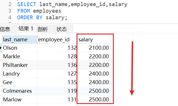 (1)根据工资由低到高排列【没有显示排序方式默认是升序】