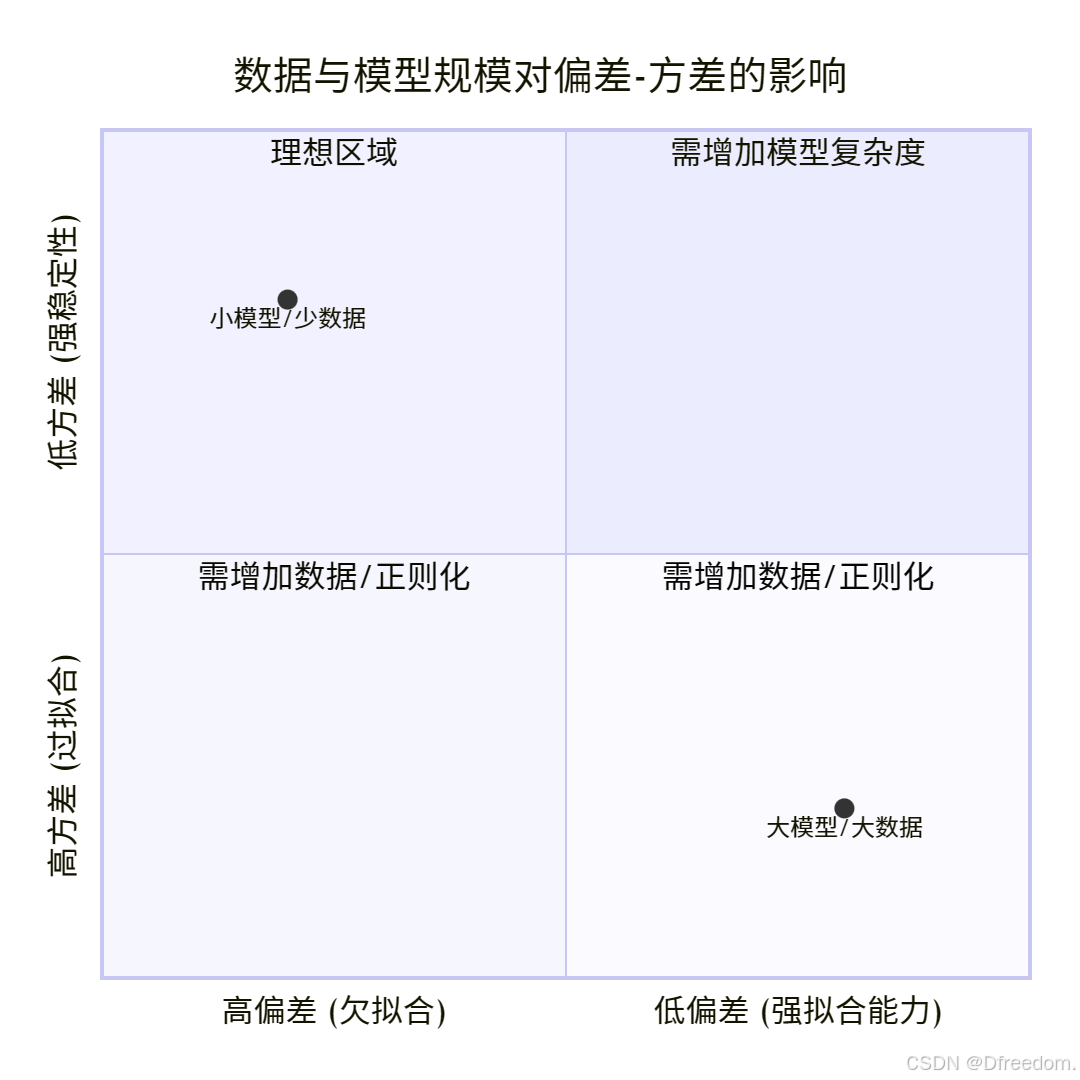 - "大数据"是控制方差的锚点 :当训练数据量极大时,模型能学到更普适的规律而非个别噪声,从而增强稳定性,将模型从矩阵的下方推向上方(低方差)。