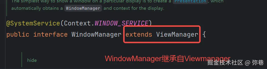 这表明WindowManager是继承ViewManager这个接口的,同时WindowManager本身也是一个接口。