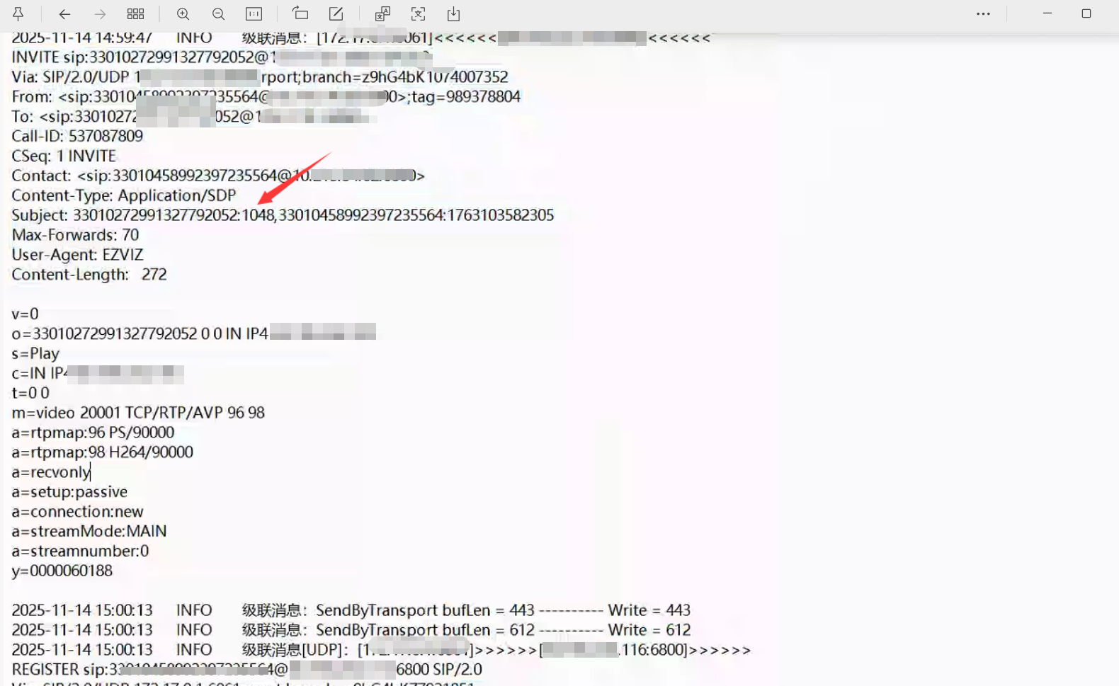 将上级平台发送invite请求中的Subject字段值由"1"修正为"0",使其符合协议规定的实时直播标识。修改后,下级平台能够正确识别并响应播放请求,通道视频恢复正常播放。