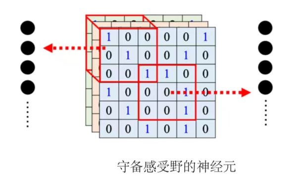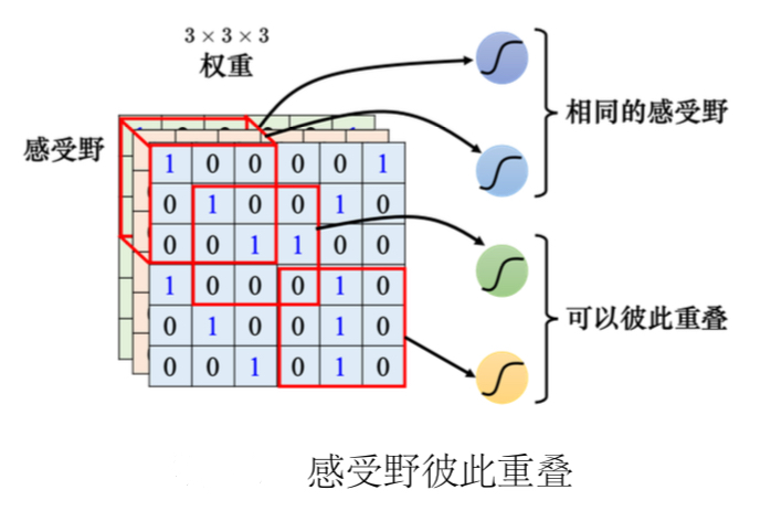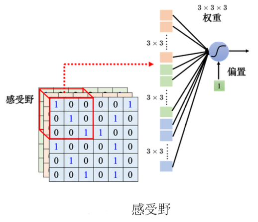 (1)感受野(receptive):由自己设定,每一个神经元都只关心自己的感受野里面发生的事情,每个神经元会把感受野中的数值"拉直"变成一个长度为n*m*k维的向量,再把这个向量作为神经元的输入,这个神经元会给这个向量的每个维度一个权重,即有n*m*k个权重,再加上偏置(bias)得到输出,再把这个输出再送给下一层的神经元当作输入。