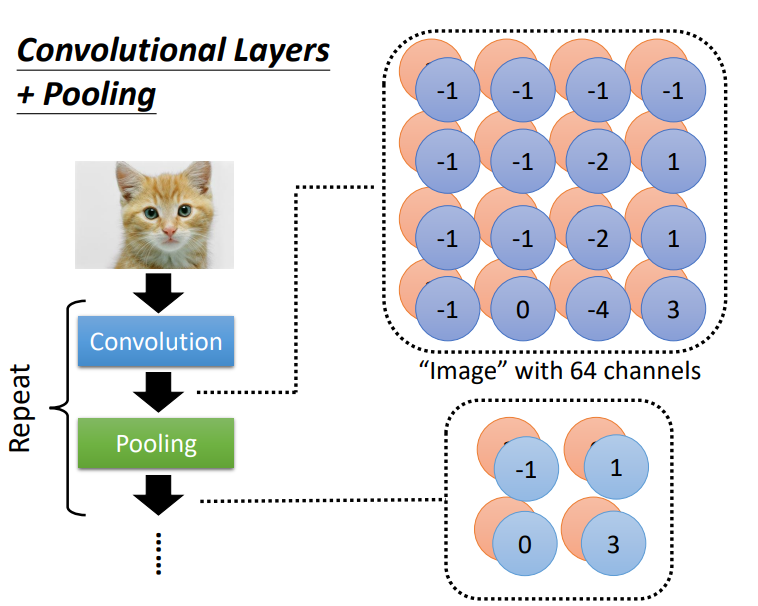 下采样不影响模式检测:把一张比较大的图像做下采样(Subsampling),把图像偶数的列都拿掉,奇数的行都拿掉,图像变成为原来的 1/4,但是不会影响里面是什么东西。