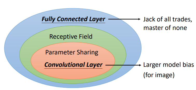 - 参数共享(parameter sharing):加上参数共享之后某一些神经元无论如何参数都要一模一样,又增加了对神经元的限制,进一步限制了网络的弹性。