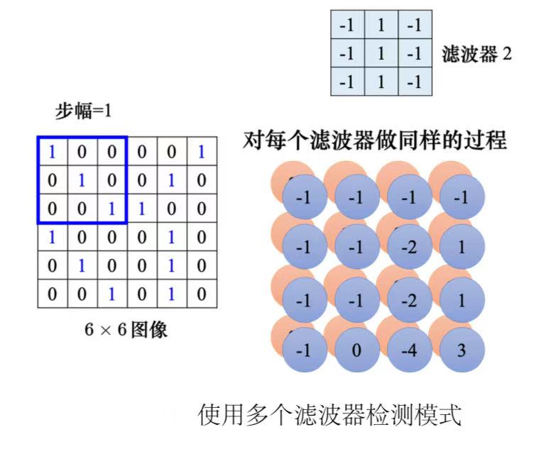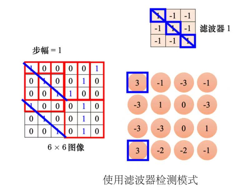3、先把滤波器放在图片的左上角,与其做内积,设置好步幅,扫过整张图片,可得到模式检测的结果。