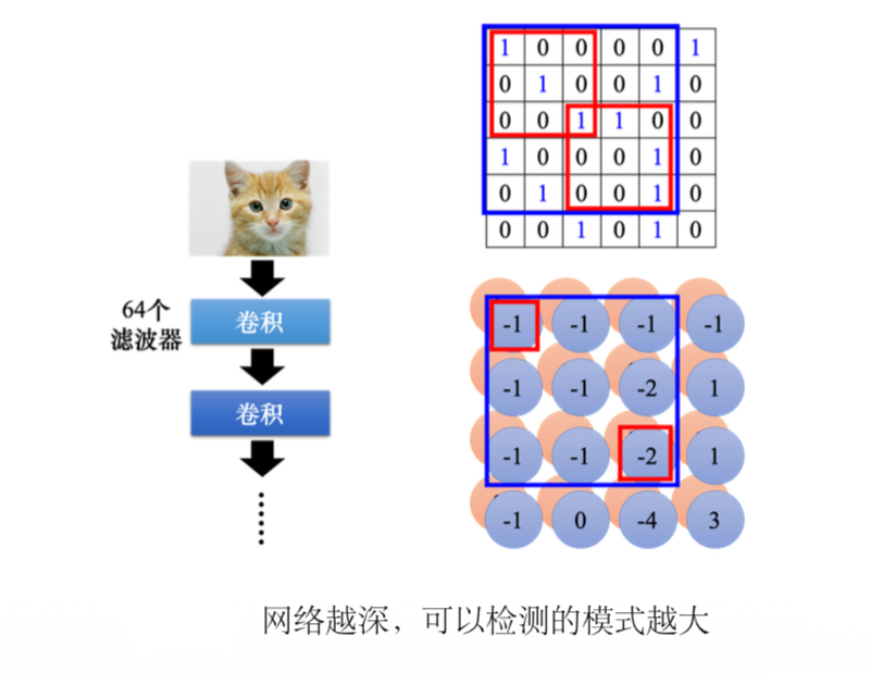 6、如果滤波器的大小一直设置的较小的,网络够深也可以检测到比较大的pattern。