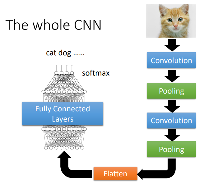如果做完几次卷积和汇聚以后,把汇聚的输出做扁平化(flatten),再把这个向量丢进全连接层里面,最终通过softmax来得到图像识别的结果。这就是一个经典的图像识别的网络,里面有卷积、汇聚和扁平化,最后再通过几个全连接层或sofmax来得到图像识别的结果。