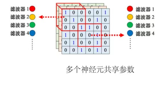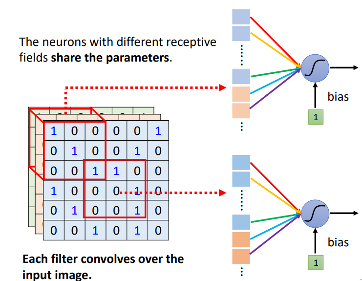 (3)总结:神经元是有bias的,滤波器也有bias。共用权重就是用滤波器扫过一张图片,这个过程就是卷积。把滤波器扫过图像就相当于不同的感受野神经元可以共用参数,这组公用的参数就叫做一个滤波器。