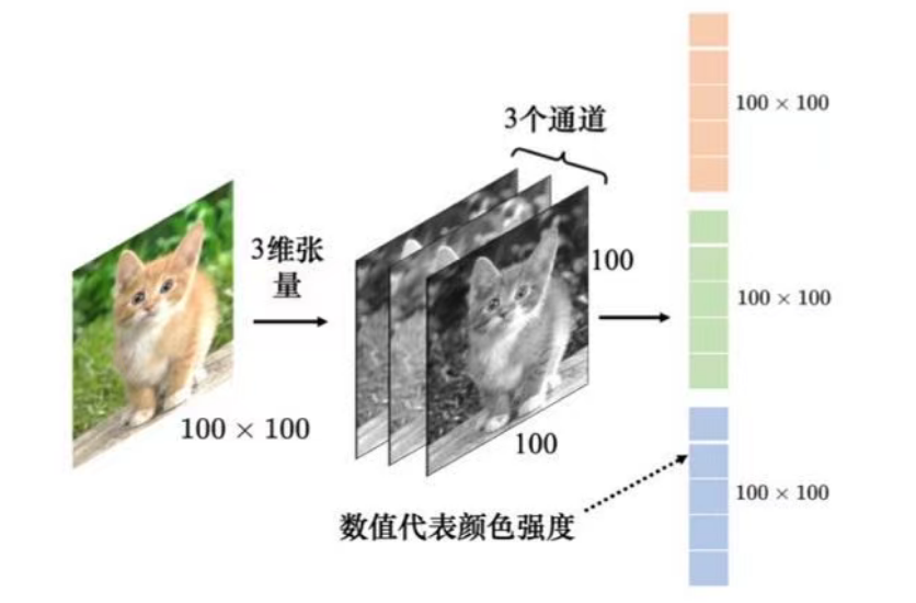 (3)输入:把三维张量转化为向量。例如:张量有100*100*3个数字,所以一张图像是由100*100*3个数字所组成的,把这些数字排成一排就是一个巨大的向量。这个向量可以作为网络的输入,而这个向量里面每一维里面存的数值是某一个像素在某一个通道下的颜色强度。