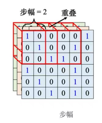 - 步幅是一个超参数需要人为调整。因为希望感受野跟感受野之间是有重叠的,所以步幅往往不会设太大,一般设为1或2。