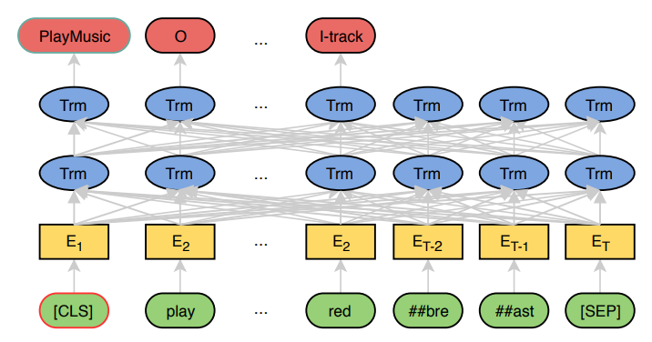 图1 描述:模型架构图。底部是输入层,显示输入查询为"\[CLS\] play ##bre ##ast \[SEP\]"。中间是 BERT 编码器层,包含多层 Transformer(Trm)。顶部是输出层,对于 \[CLS\] 位置输出意图分类结果(如 PlayMusic),对于序列中的每个 token 输出槽位标签(如 O, O, I-track)。