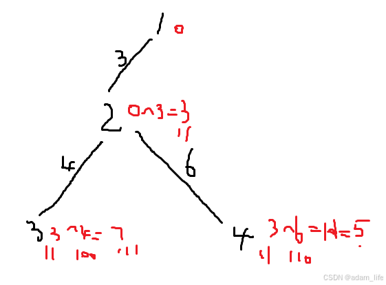 2.现在求的是"树上两个结点之间唯一路径上的所有边权的异或值",如节点1^节点2^节点3^节点4,现在"异或路径的最大值"其实就是节点1到节点3间的异或值是7。