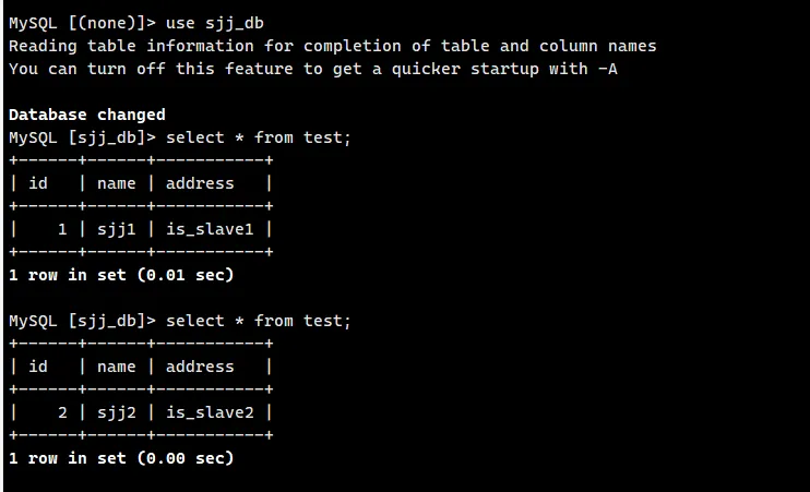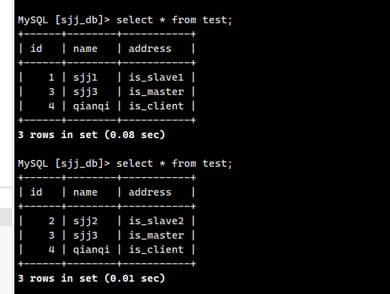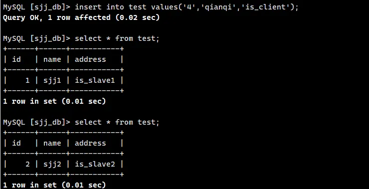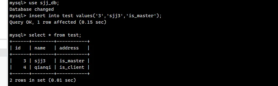 第二步:停止slave(stop slave;), 在sjj_db库插入数据