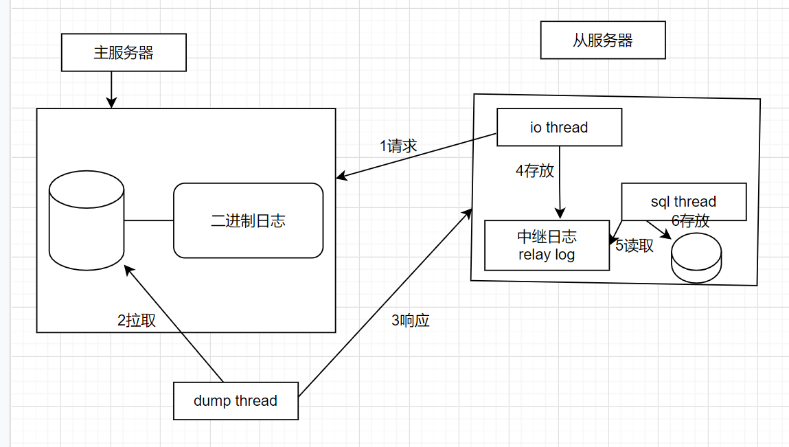2、Slave 将 Master 的复制到其中继日志(Relay log)。首先slave 开始一个工作线程(I/O),I/O 线程在 Master 上打开一个普通的连接,然后开始 Binlog dump process。Binlog dump process 从Master 的二进制日志中读取事件,如果已经跟上 Master,它会睡眠并等待 Master 产生新的事件,I/O线程将这些事件写入中继日志。