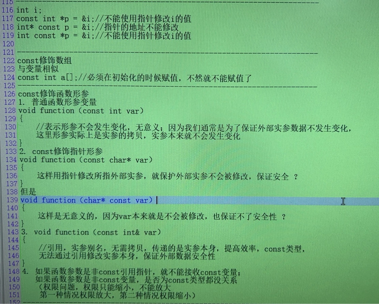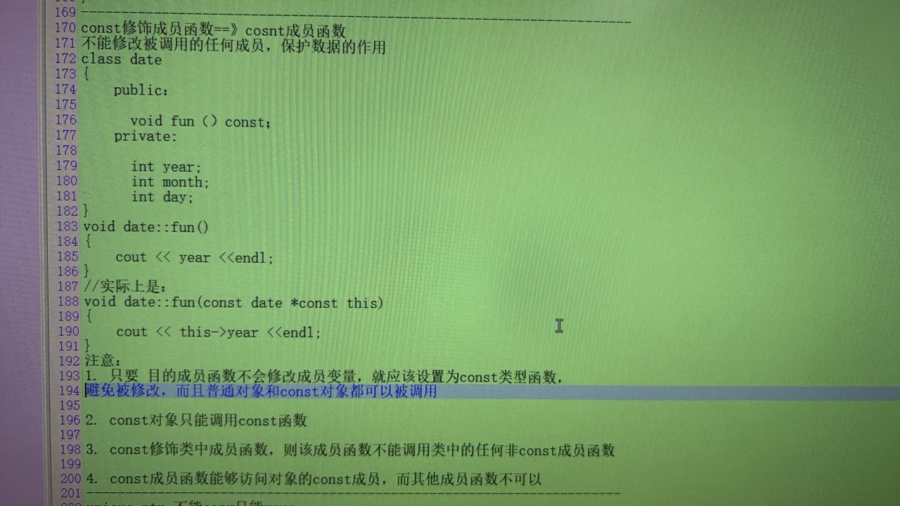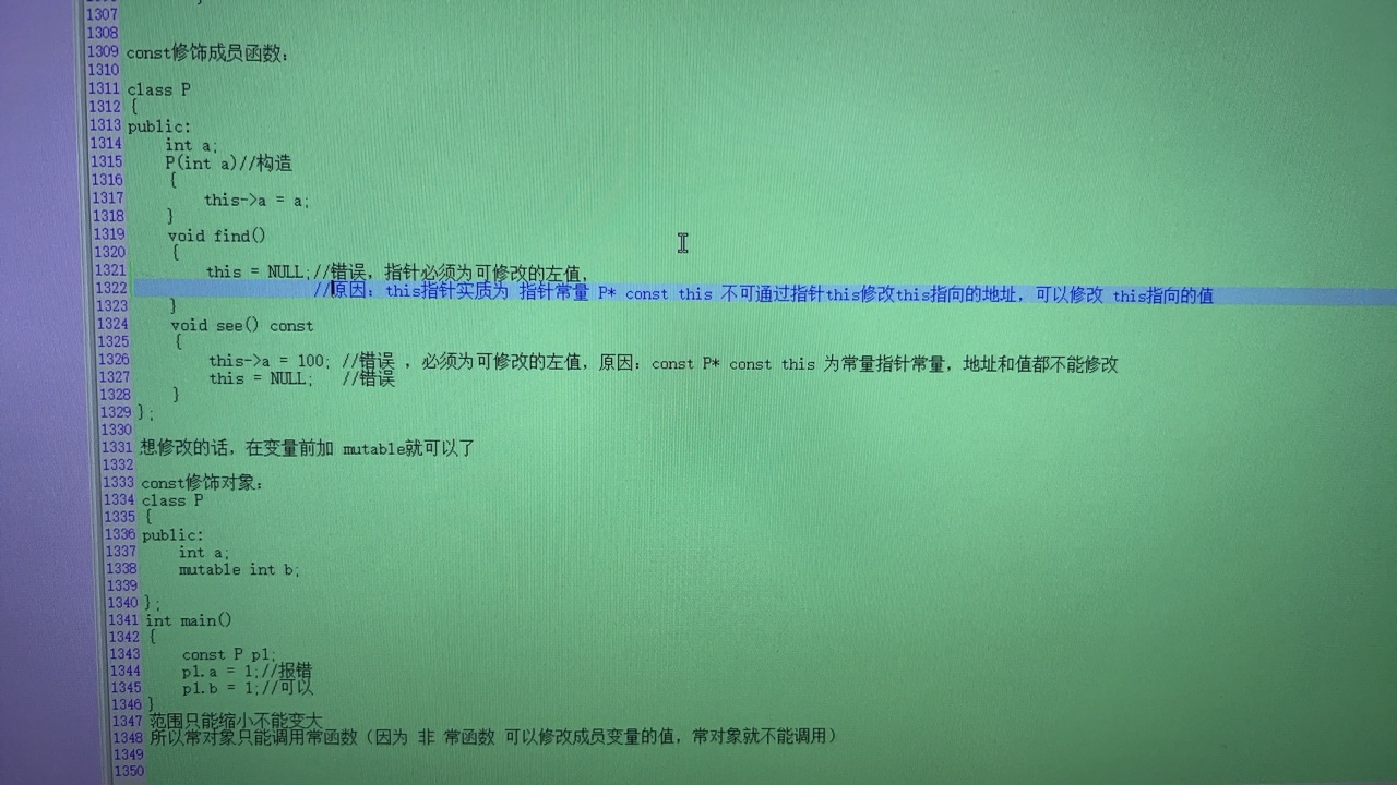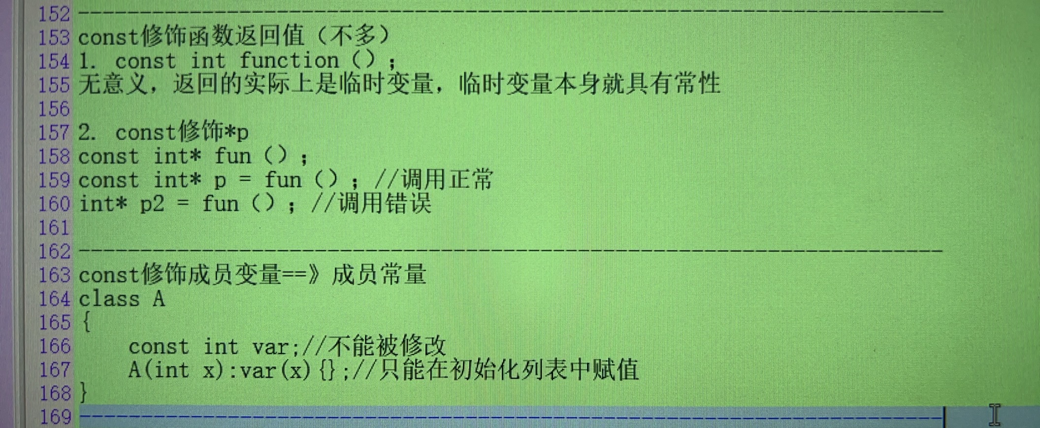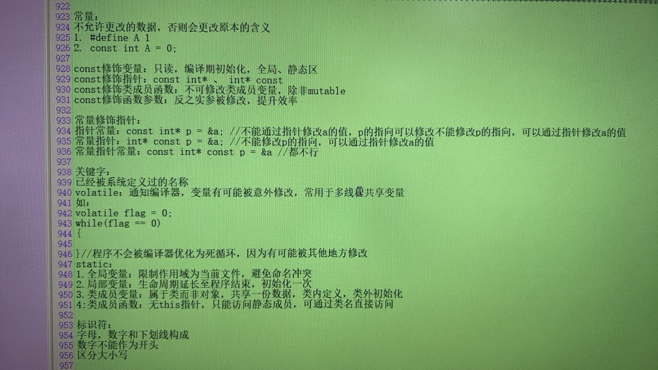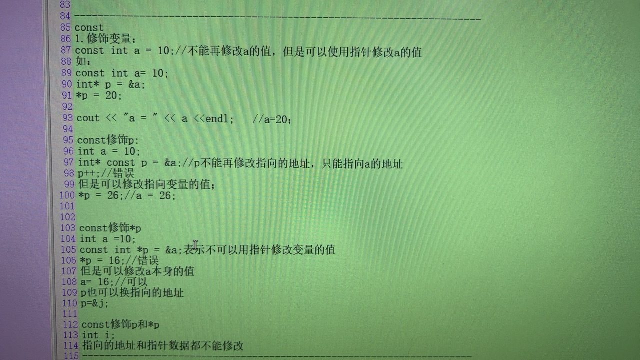 const:修饰变量,指针,数组,函数形参,函数返回值,成员变量,成员函数: