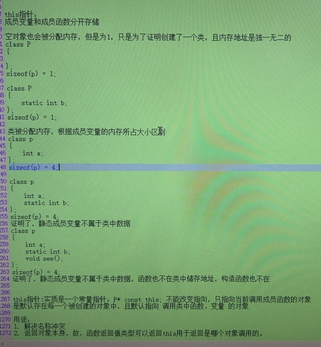 this指针,及类中数据的存储大小及区域验证: