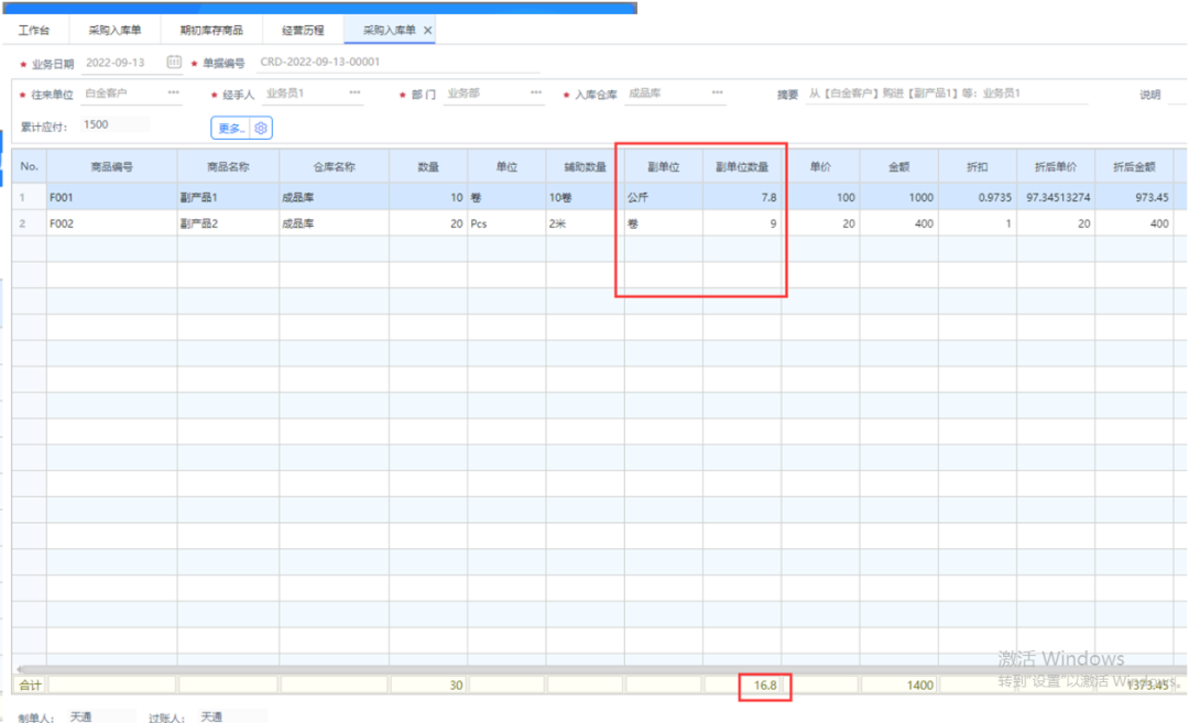 2,副单位在单据中如何录入;单据上的副单位数量与计量单位的数量没有换算关系,需要在单据中手动填写或者是设置公式进行转换(副单位数量不验证负库存)。