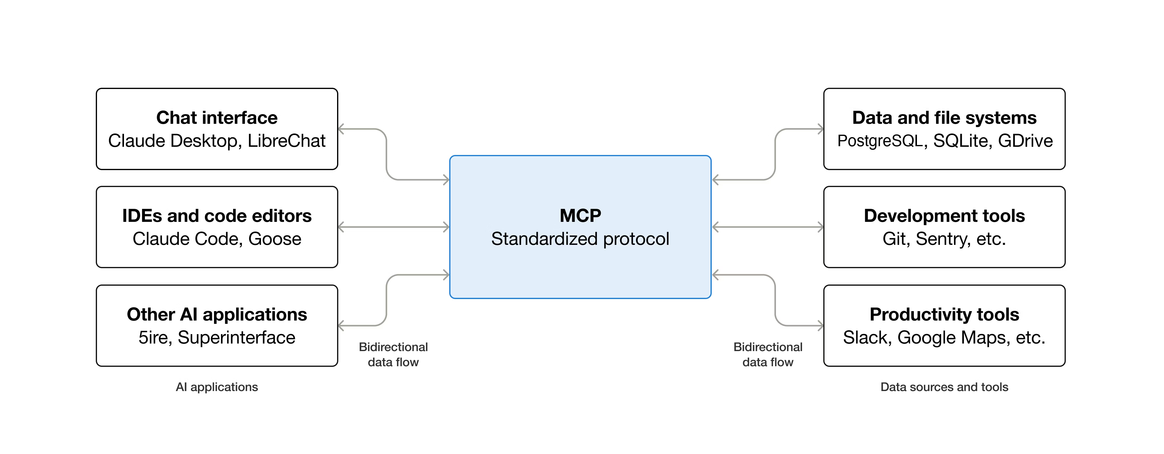 你可以把MCP想象成AI应用的USB-C接口。就像USB-C给电子设备提供了一个统一的连接方式,MCP也给AI应用提供了一个统一的方式来连接外部系统。