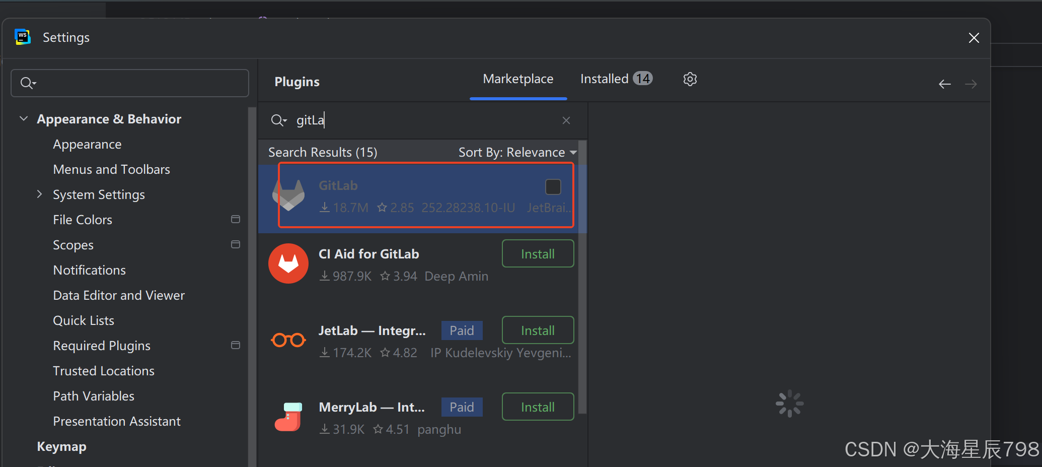 设置...(Settings...) -> 插件(Plugins) -> 已安装(Installed) -> 搜索GitLab ->