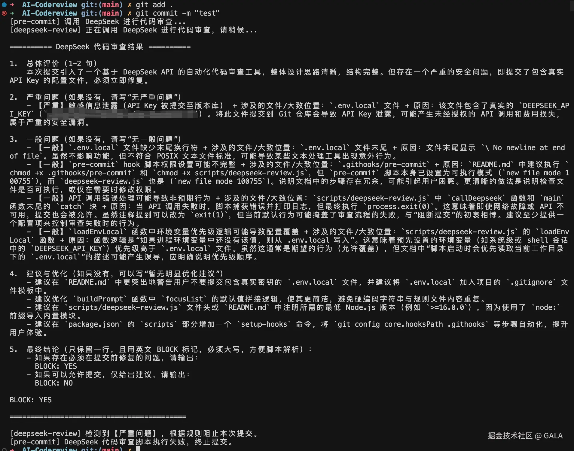 - 调用 DeepSeek → 按规则分级输出问题,并在末尾给出 BLOCK: YES/NO