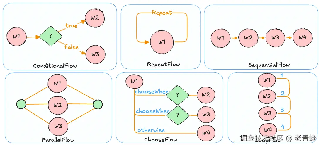 在Easy Work中,工作单元由Work接口表示,工作流则由WorkFlow接口表示。Easy Work 提供了 WorkFlow 接口的6种实现方式: