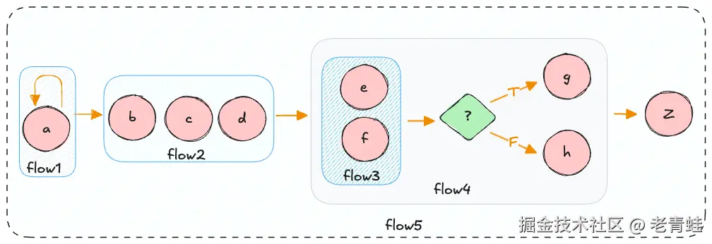 flow1是一个 打印 a 的RepeatFlow,连续执行三次flow2是一个 依次打印 b c d 的SequentialFlow, 按照顺序依次执行flow3是一个 并行打印 e f 的ParallelFlow, 同时执行flow4是一个 基于条件判断的ConditionalFlow,首先执行flow3,如果执行成功(状态为 COMPLETE)则执行 g,否则执行 hflow5是一个 顺序执行流程SequentialFlow,保证 顺序执行flow1flow2flow4,最后执行 z