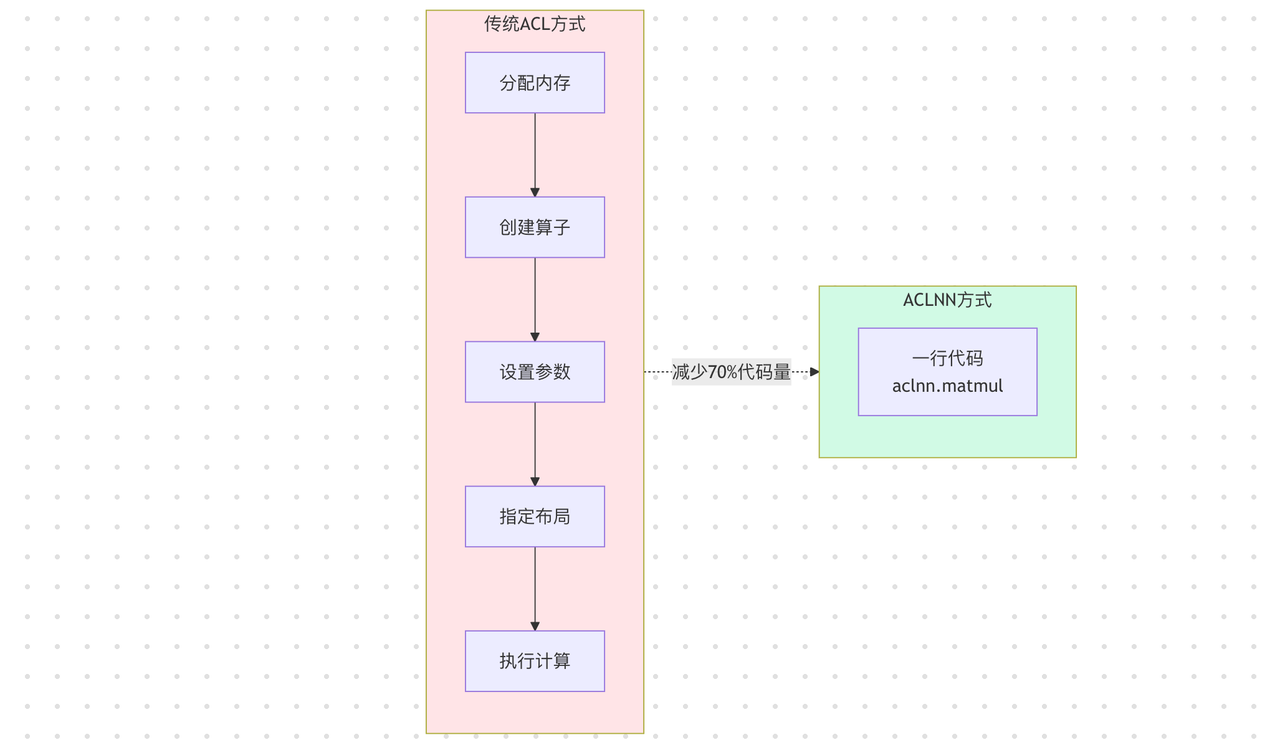 这种简化不仅让新手上手时间从3天缩短到1天,更重要的是,ACLNN能根据输入数据特征自动选择最优算法实现,在降低开发难度的同时,部分场景性能反而提升15-25%。