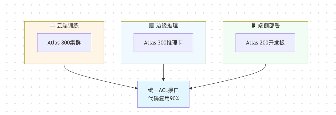CANN通过统一的中间表达层(类似于编译器的IR),将模型结构与底层硬件完全解耦。无论是云端的Atlas 800高性能训练集群,边缘的Atlas 300推理加速卡,还是端侧的Atlas 200开发套件,都使用同一套ACL(Ascend Computing Language)编程接口。这意味着开发者只需编写一次代码,就能在不同算力平台间无缝迁移,代码复用率可达90%以上。