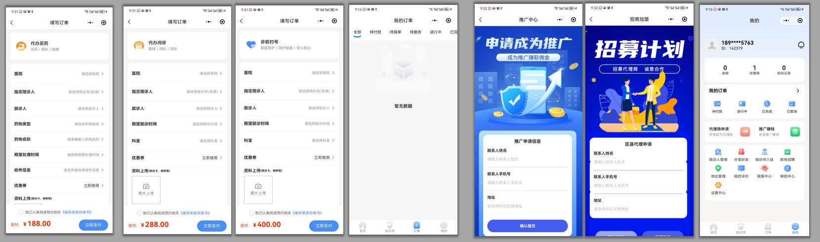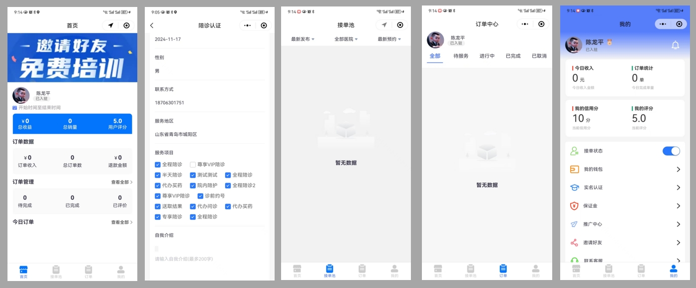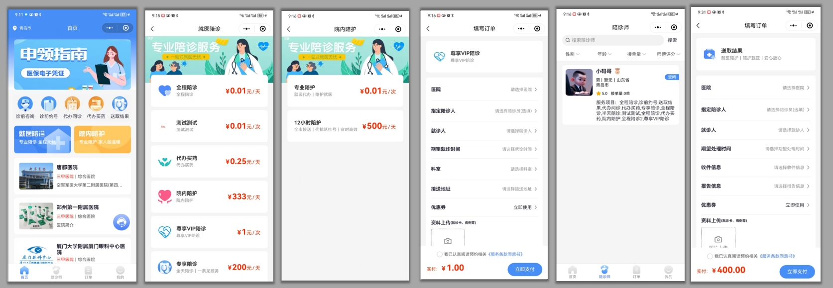 - 患者/家属: 发起陪诊需求,选择服务,在线支付,查看订单状态,进行评价。